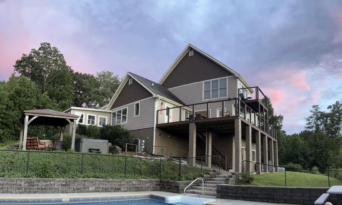 Renovated mountain property, overlooking the Hiawasse River, featuring a heated pool (closed seasonally, depending on rental requests as late as Oct). Up charge for heat, if needed. Recent 6 person Hottub. Amazing views from inside or outside, and several thousand square feet of concrete and trex decking makes this property a wonderful vacation setting. Sleeps a maximum of 10. Two sets of twin bunks are recommended for children. Tight for 10 adults.