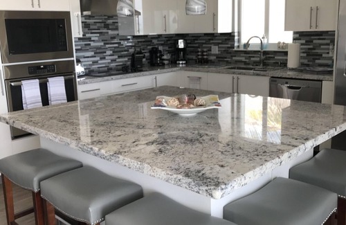 Fully stocked new kitchen with granite counter tops and a huge island for entertaining and feeding your whole family comfortably.
