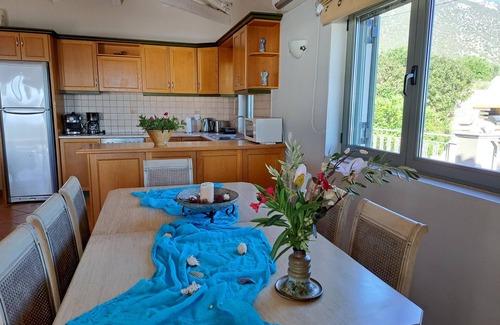 Quiet, idyllic and with a unique view of the playful coasts of the southern Argolida, the small islands of Psili and Koronida and the sea is the comfortably furnished Villa Myrto with its own pool. Salanti Bay is located in this beautiful corner of south-western Argolida, close to the pretty harbour town of Porto Cheli and the charming village of Kranidi. Above this beautiful bay on a gentle slope is the neighbourhood of Aghios Ioannis. What awaits the visitor here is a clear sea, several small bathing bays, unforgettable sunset experiences, a well-kept rural idyll, several summer houses, olive groves, Mediterranean surroundings and a charming, hilly landscape.