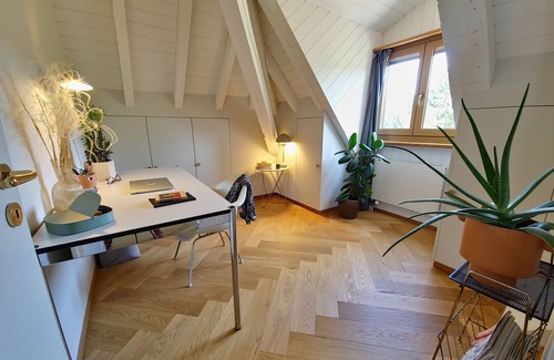 3.5 room penthouse occupying the top floor of a house located in a 3600 m2 park in Jouxtens-Mézery near Lausanne.