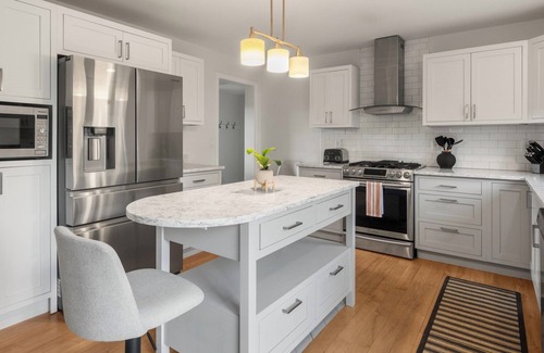 The modern kitchen, featuring new appliances and a center island, is fully equipped for preparing delicious meals. With an open floor plan, you’ll love dining in the picturesque dining room by the gas fireplace.