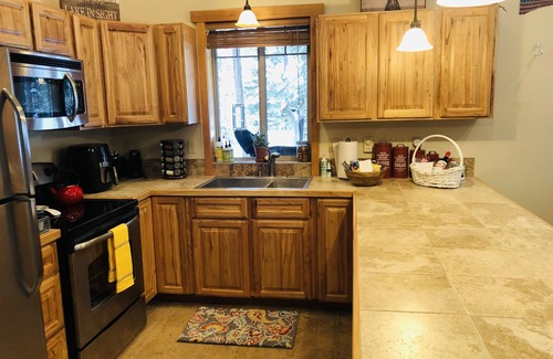 Kitchen is fully stocked with all the essentials for cooking a nice meal or baking a batch of cookies. Coffee/ Tea station that comes with a variety of tea, coffee pods, cocoa and creamer.