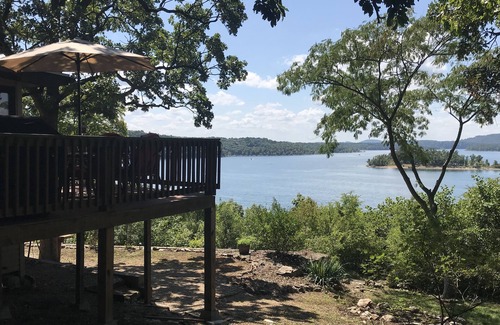 Nestled in the Mark Twain National Forest, just 15 miles west of Branson, you will find this amazing two-bedroom, two-bathroom home that comfortably sleeps 5 people. New deck, new windows, new countertops, new appliances. This property is on a lakefront lot that has an outstanding year-round unobstructed water view of Table Rock Lake. The location is a little bit of a drive from a lot of the attractions but well worth it if you are looking to be off the beaten path. There is a large lakeside deck attached to the home for relaxing and enjoying the view. The deck has an outdoor patio table, a bistro table with two chairs, and a propane grill for entertaining. Please no open fires or fireworks allowed. There are roughly 25 steps down a hill to the property. It is not handicapped accessible.