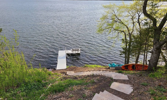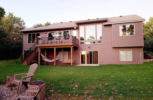 Spacious family cabin with stunning lake views! 4 bedrooms, 3.5 baths, sleeps up to 10. Only 75 minutes from the Twin Cities and a short drive to St Cloud. Cozy up to one of the two fireplaces or head outside for a campfire around the huge firepit. Fish off the dock, swim, take out the paddleboat; or head out on to the ice for some winter action. Cuddle up with a book in the 4-seasons room overlooking the lake.