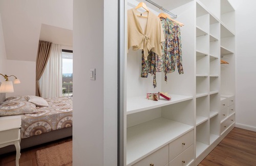 The villa comprises of big and small kitchen, dining / living room area, 6 bedrooms, 5 bathrooms, separate WC, gym, sauna and tavern with an indoor fireplace. The interior surface is 350 m2 big and it spreads over three floors. It’s big enough to comfortably accommodate up to 15 people in six bedrooms.