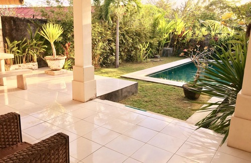 Spacious 250 sqm 2 bdr Villa&garden in Bali Nusa Dua with ensuite bathrooms, living-room, fully equipped kitchen, a breezy terrace and a 7x3m private infinity pool. Fully furnished with high speed internet, AC, TV, and security box. Minutes away from a lovely 5 star hotel beach to relax or surf, nearby restaurants, malls and to the Bali National Golf club. The rent includes weekly cleaning of the villa and change of bedsheets & towels and the villa is equipped with an integrated hygiene system.