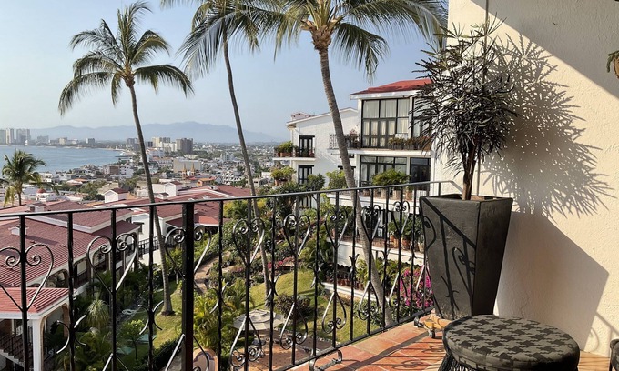 Top floor, open air condo with a with a panoramic view of the Bay of Banderas. Enjoy the fresh breezes and sunshine in a beautiful garden setting four blocks off the Malecon. Well established, secure community near the galleries in the heart of Centro, with a great variety of food, and entertainment choices, including street tacos, fine dining, and gallery hopping. Traditional clay tile floors, and vaulted ceilings. Simple, well planned flat with fully equipped kitchen opens to the bay and has great views from every room. Enjoy morning coffee and sunset cocktails from the private covered patio overlooking the grounds and out to the ocean. The friendly staff and community will make your stay memorable, relaxing, and carefree.