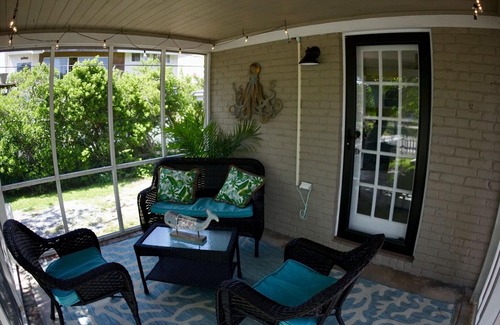 Breezy screened in porch with overhead bistro lighting contains a loveseat and 2 chairs to seat up to 4 people. Front yard is completely fenced. There are two adirondack chairs and a gas grill (propane tank provided) in the front deck/patio area There is also an outdoor shower in the backyard with hot/cold water available for your use.