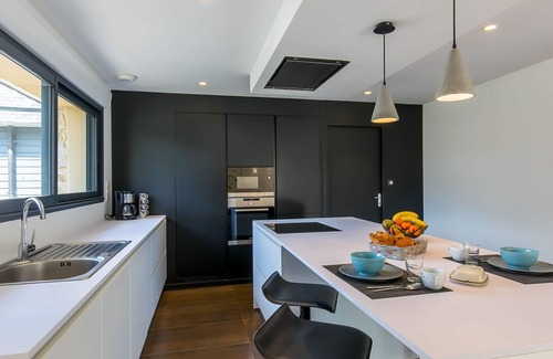 Modern, beautiful, comfortable house "Breizh Riviera". In the hamlet Pen ar Valenec 3 km from the centre of Bénodet, 16 km from the centre of Quimper, 16 km from the centre of Concarneau, in a quiet position, 4.5 km from the sea, 4.5 km from the beach, in the countryside. Private: well-kept garden 1'300 m2 (not fenced) with lawn and trees, swimming pool heated (7 x 3 m, depth 150 cm, seasonal availability: 01.Apr. - 31.Oct.) with shutter cover. Parking (for 3 cars) on the premises, single garage. Shop 3.5 km, grocery 3.5 km, supermarket 3 km, restaurant 3 km, bar 3.5 km, bakery 3.5 km, bus stop 800 m, sandy beach "Plage du Trez" 4.2 km, thermal baths "Thalasso Benodet" 4.4 km. Sports harbour 4 km, marina 4 km, golf course (18 hole) 1.5 km, surf school 4.7 km, sailing school 5 km. Nearby attractions: Pointe de Mousterlin 7.6 km, Île Tudy 14 km, Pont l'Abbé 14 km, Concarneau, Ville Close 20 km, Pont Aven 32 km, Embarcadère Archipel des Glénan 4.3 km.
