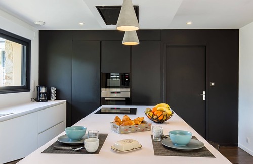 "Breizh Riviera", 4-room house 130 m2 on 2 levels. Spacious and bright, modern and tasteful furnishings: living/dining room with open-hearth fireplace, dining table, satellite TV, international TV channels and flat screen. Exit to the terrace, to the swimming pool. 1 room with 1 french bed (180 cm, length 200 cm), shower and double hand-basin. Open kitchen (oven, dishwasher, 3 induction hot plates, toaster, kettle, microwave, freezer, electric coffee machine) with dining table. Sep. WC. Upper floor: 1 room with sloping ceilings with 1 french bed (160 cm, length 200 cm). 1 room with sloping ceilings with 2 beds (90 cm, length 200 cm). Bath/WC. Electric heating. Parquet floors. Large terrace 100 m2, south facing position. Terrace furniture, barbecue (portable), deck chairs (4). Facilities: washing machine, dryer, iron. Internet (WiFi, free). Please note: non-smoking house. Maximum 1 pet/ dog allowed. Smoke alarm.