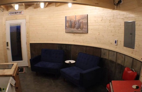 This one bedroom Grain Bin converted to a tiny home in the heart of the Midwest, has all of the comforts of home! You have the entire bin to yourself, complete with a kitchenette, full bathroom. You will have to be able to climb stairs to get to the main bed, but there is a futon on the main level. The exterior faces the corral where our cattle and horse may sometimes be, and free range chickens that may roam toward you, especially if they think you have food. We may eventually add more animals!