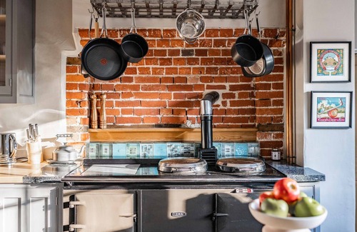 The fully-equipped kitchen is ideal for preparing meals with its combination of an Aga, electric oven, microwave, and a range of kitchen appliances. For coffee lovers, both a pod and filter coffee machine are provided. The separate dining room has ample seating for everyone, creating a warm space to enjoy meals together. A highchair is also available for younger guests.