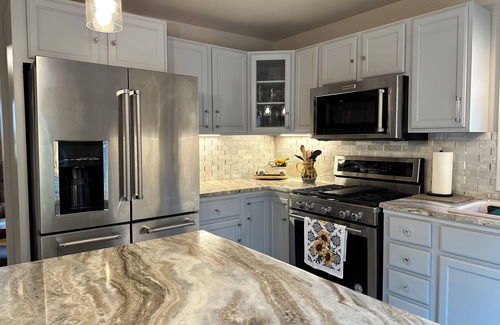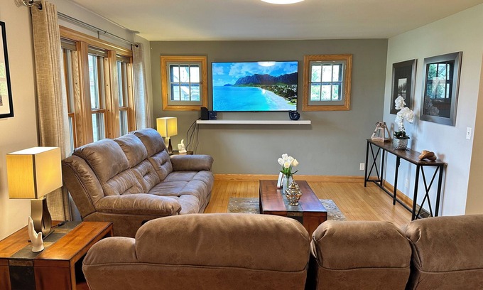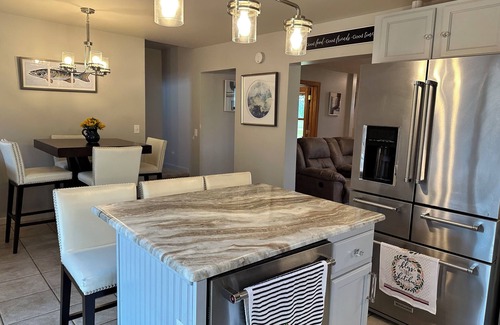 Centrally located vacation house, off from Waldo Blvd in Manitowoc, WI. This house features ample driveway for 4-5 vehicles and 2 heated garages, back deck with outdoor seating, gas BBQ and a firepit in the backyard. The interior is clean, decluttered, with all LED lighting, open concept kitchen and island with 3 stools that opens into living room and dining area. Kitchenaid appliances, including dishwasher, and granite countertops are sure to exceed your expectations. There is a formal dining room with 5 seating spaces and living room with 65 inch smart TV and comfy reclining seating. A full bathroom with lots of storage, personal shower and laundry complete the main level. Upstairs we offer 3 bedrooms and 1 full bathroom with tub and a personal shower. The king and double bedrooms have both smart TVs and all bedrooms have ceiling fans for extra comfort.