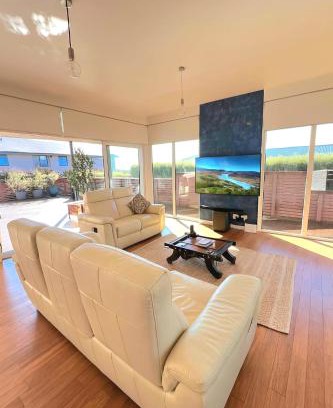 Providing a garden, Bridport Breeze features accommodations in Bridport. The air-conditioned accommodation is 1.6 miles from Barnbougle Beach, and guests can benefit from private parking available on site and free Wifi. Outdoor seating is also available at the vacation home. Featuring a balcony with sea views, this vacation home also includes a flat-screen TV, a well-equipped kitchen with a dishwasher, an oven, and a microwave, as well as 2 bathrooms with a walk-in shower and a hair dryer. The accommodation is non-smoking. Barnbougle Dunes is 4.2 miles from Bridport Breeze. Launceston Airport is 51 miles from the property.