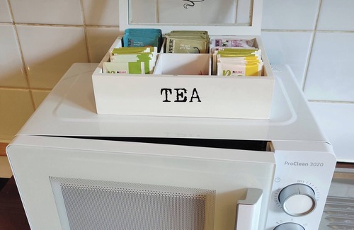 - Fully-equipped kitchen with microwave, coffee machine, electric kettle, toaster, pots and pans, plates, bowls, glasses, and cooking utensils