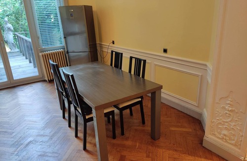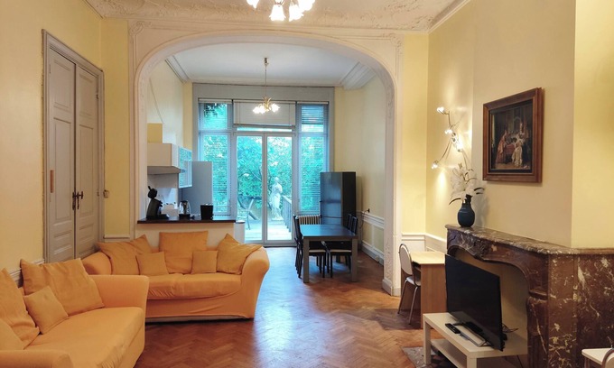 This classy 1-bedroom apartment (80m²) is located on the elevated ground floor of a superb Belle Epoque town house in the much sought-after Montgomery neighbourhood, two metro stops away from Schuman station and 5 stops (10 minutes) away from the Central Station. There are 3 metro stations within 5 minutes walk. The Central Station (Grand Place) is 10 minutes away by metro.