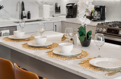 As you step inside, be prepared to be awed by the contemporary design and impeccable attention to detail. The open-concept living area welcomes you with its abundance of natural light and stylish furnishings. The expansive windows not only fill the space with warmth and brightness but also offer breathtaking views of the surrounding cityscape. Sink into the plush sofa and unwind after a day of exploration, or gather with loved ones to plan your next adventure. A large flat-screen TV with cable channels is available for your entertainment needs, ensuring you never miss your favorite shows.