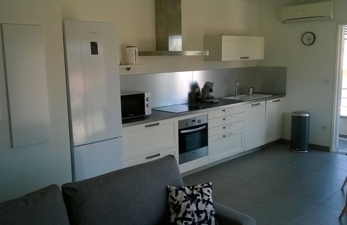 Living room with tables, chairs, TV cabinet, coffee table, sofa, fully equipped kitchen: dishwasher, oven and induction hob, microwave, fridge-freezer combination, coffee maker, toaster, dishes, pots and pans, plancha…