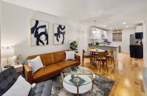 <Thoughtful Amenities: The kitchen is stocked with utensils and cookware for nights in, while high speed WiFi six lets you stream or work without buffering. You will also find a full size washer and dryer with supplies provided, plus dedicated garage parking for a compact vehicle and plentiful street parking nearby.