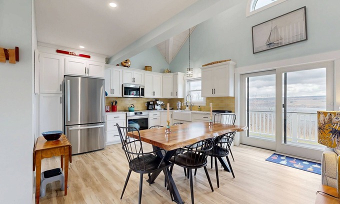 Step inside to an open and airy main living space with high ceilings and large windows that flood the rooms with natural light. The open-concept layout combines the living, dining, and kitchen areas, making it ideal for families or small groups to gather and relax. Sliding glass doors open out to the deck where you can enjoy your morning coffee while the sun rises over the lake, or unwind at dusk with a glass of local wine.