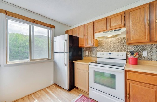 Inside, enjoy a well-equipped full kitchen with cooking basics provided. The living room has a TV equipped with cable and room to spread out. The primary bedroom has a king size bed, a smart tv, and an ensuite full bathroom. The additional bedroom has a queen bed and bunk beds, with a twin size on top and a full on the bottom. There is one additional full bath. Outside, there is a deck with outdoor furniture to enjoy in the warmer months, and a seasonal pool to enjoy. Beyond the property, the options for adventures are endless!