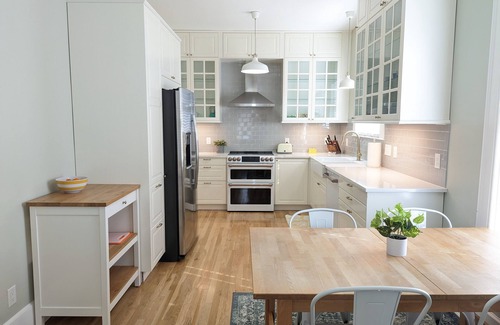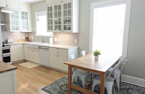 Bright, spacious, and elegant 1920s Hyde Park home. Completely remodeled in 2016 and well cared for, it has 10 footceilings, lovely original features like a carved archway and original refinishedhardwood floors,and marble bathroom tile. There is a large yard, and the neighborhood is quiet, but easily walkable to coffee shops and a bus stop. There are two bedrooms with queen beds - the largest bedroom has slidingdoors, adesk and a large dresser, and the second bedroom has a large closet. There is a beautifuleat-in kitchen with GE Cafè appliances, farmhouse sink, and stackable washer and dryer. A 65inch smart TV makes it easy to log in to any streaming service and relax. Large windows in every room provideplenty of natural light all day long.The home has everything that you would need from dishes, pots and pans, bakeware, toaster, stove, refrigerator, table and chairs, towels, fresh sheets, iron, Dyson vacuum, etc.