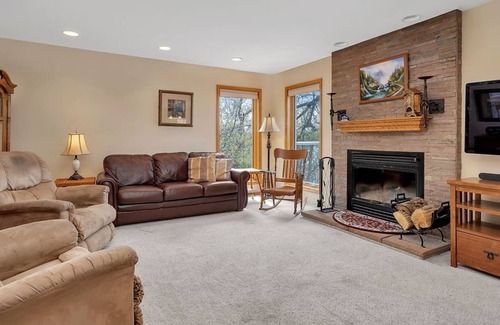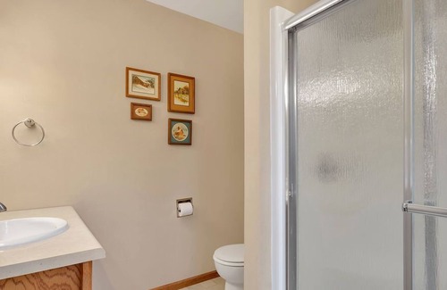 Come and stay in our spacious cabin overlooking the inviting Lake Metigoshe! Our bright and welcoming home has everything you need to enjoy your stay at the lake, including a great view of the lake from the open concept kitchen with French doors leading to a deck. Park your boat or jet ski at the dock, and enjoy the perfect place to watch the sunrise with a cup of coffee on the deck, host the family for a midday barbeque around the firepit, or watch the sunset with a cocktail. In the living room area there is a stone fireplace for those chilly days and lots of seating. There are four bedrooms, two with a king size bed, one with two twins, and another room with a queen bed. There are three full bathrooms, one of which has a jacuzzi jet tub and a second living room area upstairs allowing plenty of space to spread out. We have a washer and dryer and a full basement with another queen size futon for sleeping. Our open and airy kitchen has double ovens and a dishwasher, making this the perfect place to cook and enjoy all your meals. Take a seat at our dining room table looking straight out to the lake while your group has their meals.