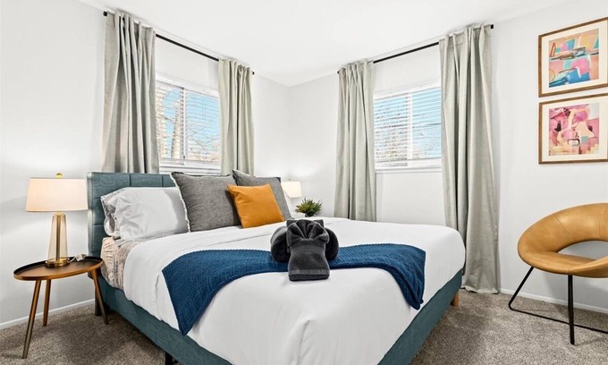 We know sleep is important while traveling! The bedrooms contain one King + one Queen size bed with brand new, luxury memory foam mattresses, perfect for a comfortable night's sleep. The bedrooms feature blinds + black out curtains & night stands with USB lamps. Closets contain hangers + hampers for your clothes. There is also an iron and ironing board in the Master bedroom to ensure your clothes remain wrinkle free.