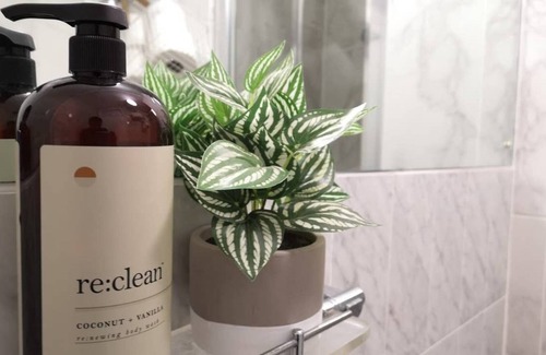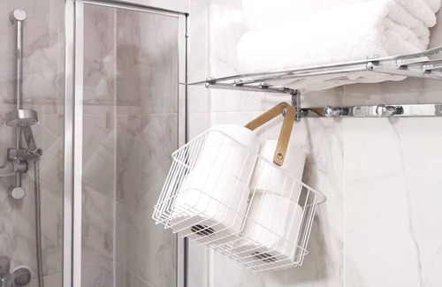 The en-suite bathroom is accessible only through the bedroom and has a shower. While there's no bath, we've made sure that everything else you need is there, including fresh towels, toiletries, and a hairdryer.