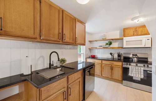 Our home is the upper level (second story) of a duplex with its own entry via an exterior stairwell located right next to the driveway. The kitchen, living room, office nook, bathroom, and both bedrooms are all located on one level. Outside but up the stairs, we also have a gas grill and on the ground level through a small gate, you'll find a small sitting area with a fire pit that is shared with the lower level unit guests (also a rental unit).