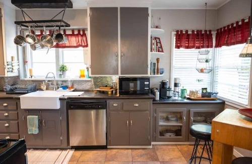 You enter to a bright comfortable living room with floor to ceiling picture windows looking out to a greenery-enclosed front yard. The living room has a big soft comfortable couch, white stone fireplace next to a 55 in TV with Sono speaker surround sound throughout the living room. Formal dining room, 2 bedrooms with kingsize and queenside beds. The couch and a blow up mattress are the other sleeping areas. Full kitchen that was actually featured on HGTV's "Over Your Head" (A show from years ago) that installed a farm sink, cement counter tops and Stainless Steel Subway Tiles.
