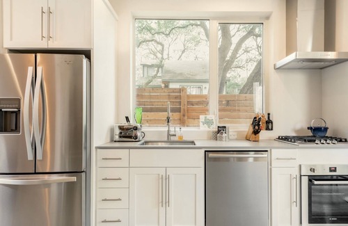 A stunning 842 SF detached two-story Guest House in the heart of South Austin, separated from the Main Home by a tree-filled privtate entry. You'll have a full kitchen, dining, living area and a study/work space (desk & LCD monitor) and a half bath downstairs. Upstairs is a bedroom with a King Bed, walk-in closet and an elegant bathroom with a huge, dual-head shower. Guests also have part of the back yard, outdoor seating and a fire pit/chimnea to use that is partitioned from the rest of the yard. You will also have a Smart TV with streaming apps and a full size washer & dryer.