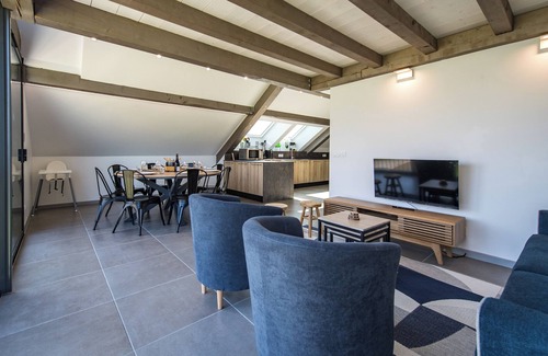 The large, bright living area features a cozy lounge with a TV, a welcoming dining space, and a fully equipped open kitchen (oven, coffee machine, etc.) to prepare delicious meals after a day on the slopes. The sofa is convertible.