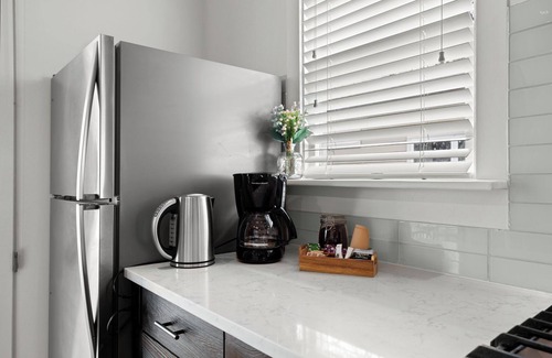 This 1930s bungalow features all original shiplap and hardwood floors, teardrop siding, and a beautifully landscaped yard with shared heated plunge pool, shaded by the canopy of an old-growth elm tree. Completely renovated and equipped with all modern comforts, this 2-story house offers 2 bedrooms, 3 beds and 2 bathrooms, a dedicated work space with a monitor and keyboard/mouse set up, reading nook, and a spacious loft for kids and adults to enjoy. Enjoy the well-appointed kitchen with everything you need to prepare a delicious meal or at least your morning cup of coffee or tea before heading out to explore Austin’s incredible food scene. Eat at the breakfast counter or on the back porch. G-fiber internet with gigabit speed and fast mesh WiFi throughout all corners of the house.
