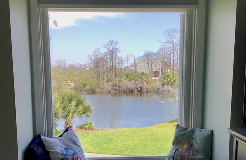 Also on the first level is a bright and welcoming bedroom with a private balcony that enjoys the morning sun and nice views of the pond and the lake. This bedroom is setup with a comfortable double bed that has a single pull-out trundle bed, which provides room for up to 3 people to sleep. This room has a flat screen TV and ample space to unpack. There is a full bathroom with a tub/shower combination conveniently located between the kitchen and this bedroom.