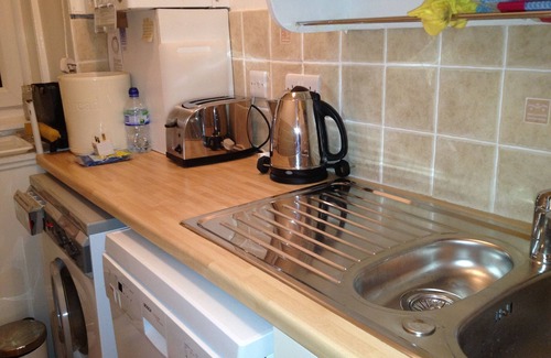There is a modern kitchen with all appliances, i.e. oven, hob, microwave, fridge freezer, washing machine, dishwasher, kettle and toaster etc.