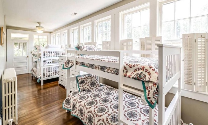 The interior design perfectly complements the room's natural brightness, featuring crisp white bunkbeds that reflect the morning light and create a clean, fresh aesthetic. Beautiful white shutters frame each window, while bright, cheerful paint colors remind guests that there is so much beauty and adventure to look forward to just outside their door. This thoughtful color palette enhances the room's uplifting energy and creates the perfect environment for rest and rejuvenation.