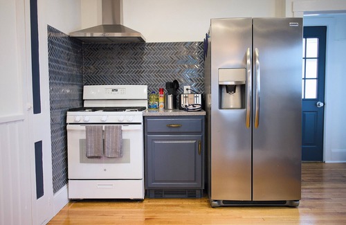 This bright and modern first-floor apartment offers comfort, convenience, and thoughtful touches throughout. Large windows fill the home with natural light, complemented by recessed lighting and ceiling fans in every room. Window A/C units are installed during the summer for added to keep things cool. It comfortably sleeps 4–6 guests with two queen bedrooms and a bonus room with a convertible queen sized futon (extra sheets, pillows, and blankets provided).
