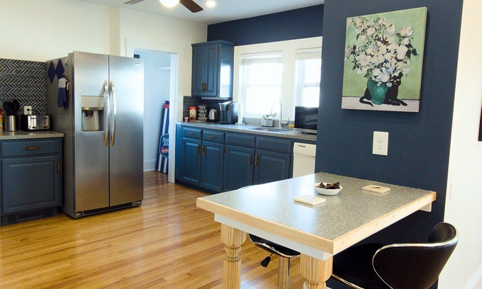 The kitchen is fully equipped with a full-size fridge (ice & water dispenser), stove, microwave, toaster, Keurig (with coffee), cookware, and utensils. Dine at the four-person table (or add seating with the kitchen island bar stools). Wall mounted ironing board and iron included.
