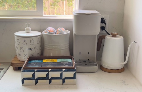 The coffee station includes a coffee maker, hot water kettle, complimentary coffee and tea. You’ll also have access to an in-unit washer and dryer—convenient for longer stays.