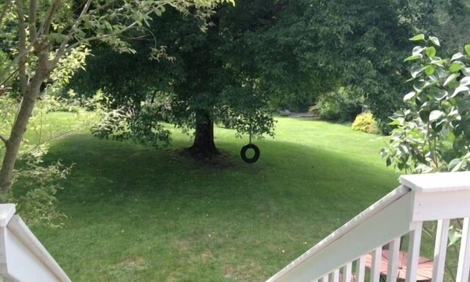 The huge backyard provides a lovely view with a towering oak tree and a rolling lawn. At the far end of the yard is a pond and stone patio. In the spring and summer there are frogs in the pond, and the occasional turtle.