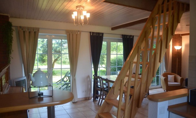 Our cottage with large garden Lizt comfortably accommodate 4 people. It has a living-dining room (sofa with armchairs) with open kitchen area, a bathroom and two separate bedrooms each with a double bed. A restored, shellac hand polished black Bechstein piano enters his accent in the friendly space. The first floor with the bedrooms can be reached via a somewhat steeper wooden staircase. Three large outer doors open to the spacious garden with terrace and integrated fire pit. The house is very quiet, about 150m walk from the riding school and boxes.