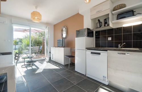 This cozy and light-filled 55 m² villa in Sérignan offers a relaxing seaside escape for up to 6 guests. With 2 bedrooms and a welcoming layout, it’s ideal for families or small groups. Located just 450 meters from the sandy beach, 1 km from a restaurant, and 2 km from a supermarket, it combines convenience with coastal charm in a peaceful, family-friendly zone. The villa features a private fenced garden with outdoor furniture and a barbecue, perfect for alfresco dining and lounging. Guests enjoy modern comforts like air conditioning, electric heating, a TV, and access to a communal heated swimming pool. Open-air parking within the building adds to the ease of your stay. Inside, the open-plan electric kitchen is fully equipped with a refrigerator, microwave, dishwasher, coffee machine, toaster, kettle, and all essential dishes and utensils. Whether you're preparing a beach picnic or a relaxed dinner, this villa offers everything needed for a comfortable and enjoyable holiday.