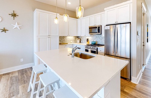 Back at home, comfortable furnishings in the main living area allow you to get cozy while you enjoy a movie on the TV. A full suite of stainless steel appliances in the open kitchen ensures you'll have all you need to prepare delicious meals. Enjoy these dishes at the center island with bar seating, or the quaint dining area. The home also boasts a second-floor living area with a sofa, bean bags, and an additional TV for additional leisure.