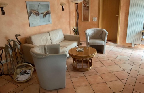 Rhine-Tuscany Modern equipment. Italian style kitchen, fully equipped. Living room with sofa, coffee table and sofa. New bathroom and bedroom. Washing machine, bathrobes, towels are available. Beds are made, extra blankets and pillows on request. Small furnished terrace. Storeroom available. Apartment (ground floor) in a multi-family house. View of the Rhine Valley. Hillside. 3 minutes to the bus stop, 5 minutes to the orthopedic specialist clinic, church square and Stadthalle. DTV classification: ***