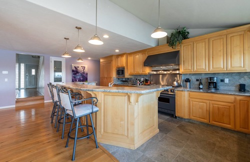 The expansive great room is perfect for a family reunion or multi-family trip! It has a theatre-like TV and second TV over bar, large sectional sofa, plenty of extra seats, and fireplace with electric insert. Gorgeous kitchen has granite counters and bars/barstools, 2 sinks, Viking Pro gas range, well-stocked pots/pans/utensils, and plenty of dishes. Sunken bar features a mini-fridge/freezer, ice/water dispenser and bar tools. The separate pantry has a commercial fridge and freezer, pass through window to deck, and plenty of space for whatever food and snacks you’d like. Dining seating for 18 at the table, bar counter, and kitchen counter. Plenty of plates, glasses, utensils and cookware for the whole crowd.