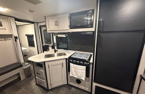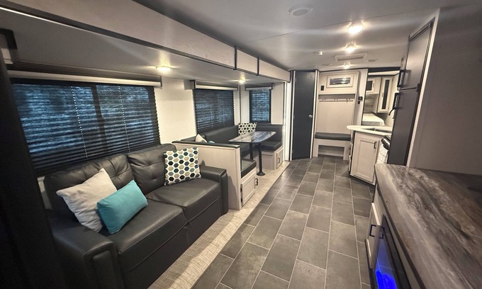 Located in Afton, enjoy what this newer 2023 recreational vehicle has to offer. This cool property features 1 king bed, 1 large bunk bed with plenty of space for 2 adults, 1 sofa bed in the cozy living room space with an additional full bed possible with the convertible dining table. Ample space for 7 adults. An electric fireplace with 58” TV above, heating, AC, an outdoor kitchen with large air fryer oven, and wifi provided! Guests can relax and unwind in this beautiful RV. There is a private boat ramp to access Grand Lake, with daily slips available for rent. Jetski docks as well as fishing docks. A local restaurant and bar within 1 mile.