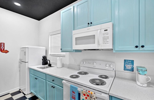 Located on a quiet residential street, the Doo-Wop Den is just a short walk from a local park featuring multiple pickleball courts and a playground. We provide pickleball paddles and balls, so you can jump right into a match during your stay.
