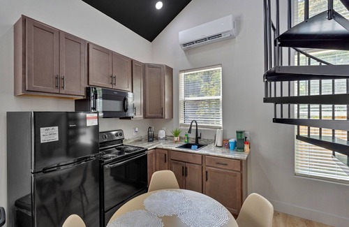 This is a cozy 2-bedroom, 1-bath, 900 sq ft, two-level home! Inside, you'll find a spiral staircase leading to the upstairs game area, complete with a golf arcade machine, foosball, magnetic darts, cards, and a small putting green. The home offers one queen bed and twin bunk beds, approved for adults with a 325-pound weight limit. All rooms have smart TVs, so you can access your favorite streaming services (no cable available). Enjoy a Keurig coffee machine with pods provided.