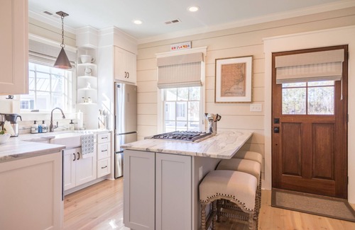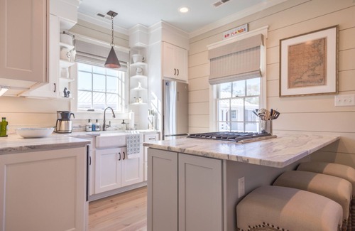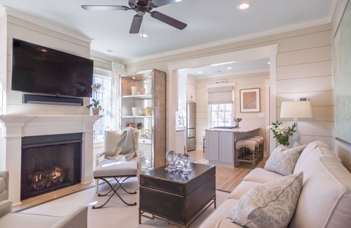 Broad Creek Cottage is a two bedroom, two bath weekend getaway part of the Southern Living Inspired Community on Boathouse Row. The apron-front sink, stainless steel appliances, custom shaker-style cabinetry and gas fireplace are some of the great features. This cottage also includes king bed in the master and a queen bed in the second bedroom, stackable washer and dryer in a laundry closet as well as basic cable and Wi-Fi. Screened porch and shared fire-pit overlook the harborview location.